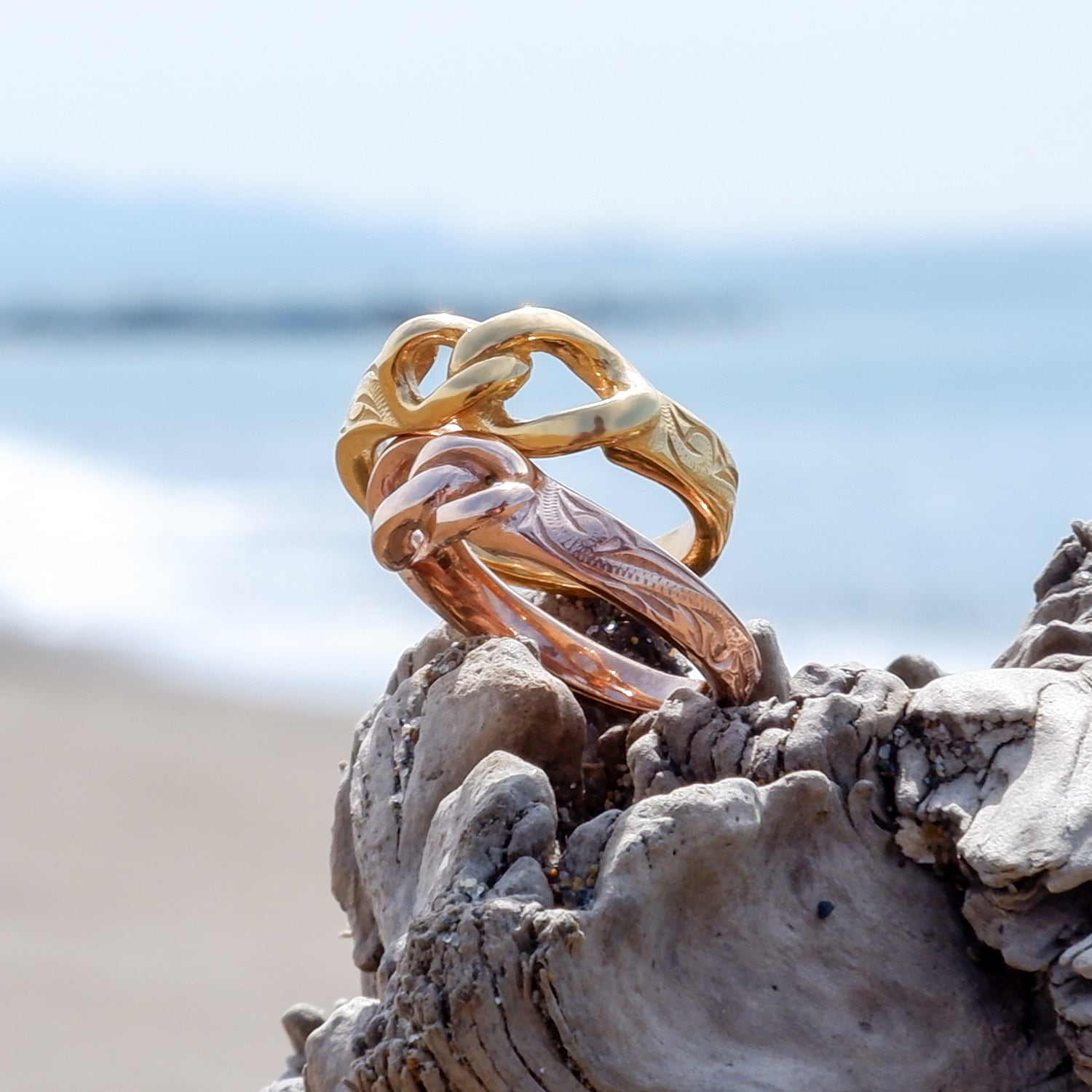 「途切れることなく幾度も繰り返し打ち寄せる幸せの波」スクロール(波)の彫りが刻まれています。