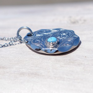 ターコイズの色はやや青みがかっており、石の中にはマトリックス(スジ)が含まれています。石は艶やかさがあり、幻想的はマトリックスの輝きと美しさは、世界にたった一つのペンダントです。