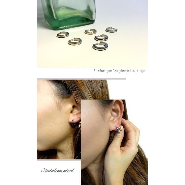 3カラーパーフェクトフープステンレスピアス。ブラック・ブルー・ピンクゴールからお選び頂けます。ファッションを選ばない、どんなスタイルにも良く合うシンプルピアスです。