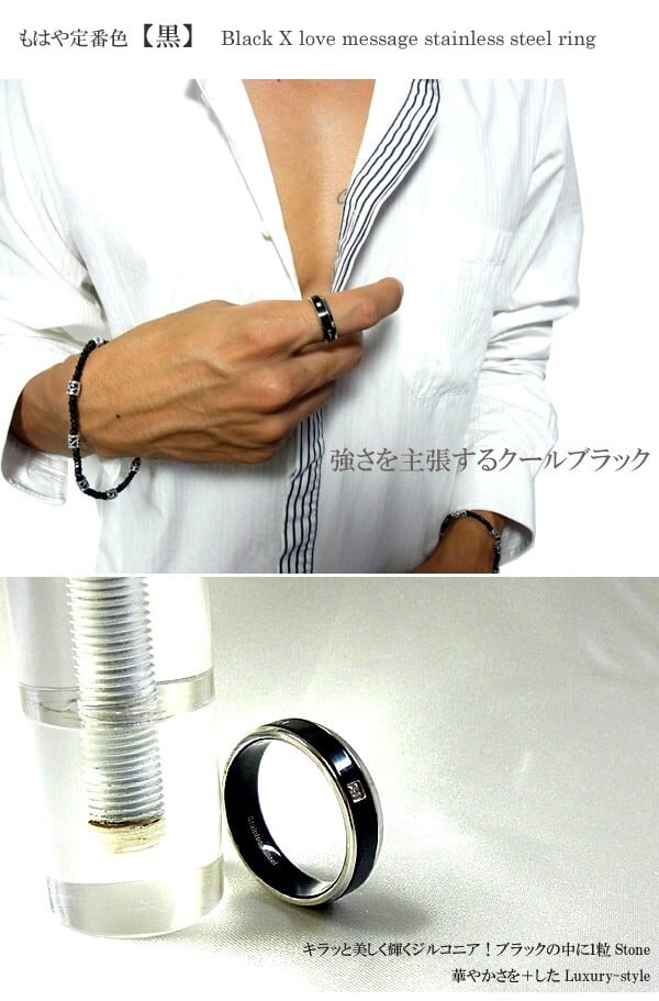 リングにカラーラインを斜めに走らせたデザイン!一粒セットされたジルコニアがポイント”リングに書かれた言葉は 「Love Conquers all」 “愛はすべてを征服する”…素材はStainless steel316Lを使用しているので、海はもちろん温泉・汗でも黒ずみ、黄ばみ、錆びは心配ありません。リングの内側には角が無く、なめらかな肌ざわりで長時間装着しても疲れる事もなく気兼ねなく着けられます