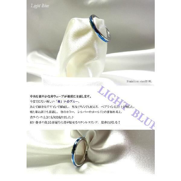 中央を緩やかな青ウェーブが優雅に主張します。今までにない新しい「青」ライトブルー。あえて細身なデザインで構成し、男女どちらでも使える、ペアラインに仕上げました。また重ね着けも意識し、他のカラー、シルバーやゴールドとの愛称を考え、青ラインの太さにも気を配りました♪使い勝手の良さと普遍的な青が魅せるステンレスリング、是非お試しを!また、青色の指輪は幸せを招くと言われ半永久的に輝くステンレスは人生を共に歩むパートナーにピッタリ!!
