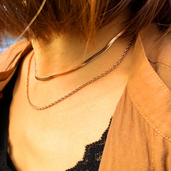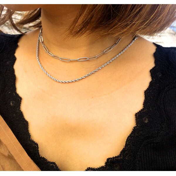 ロープのように編み込まれた形状と表面のカット加工がキラキラと輝き、首に沿いながら着け心地を重視してます。男性にも女性にも好まれるネックレスです。