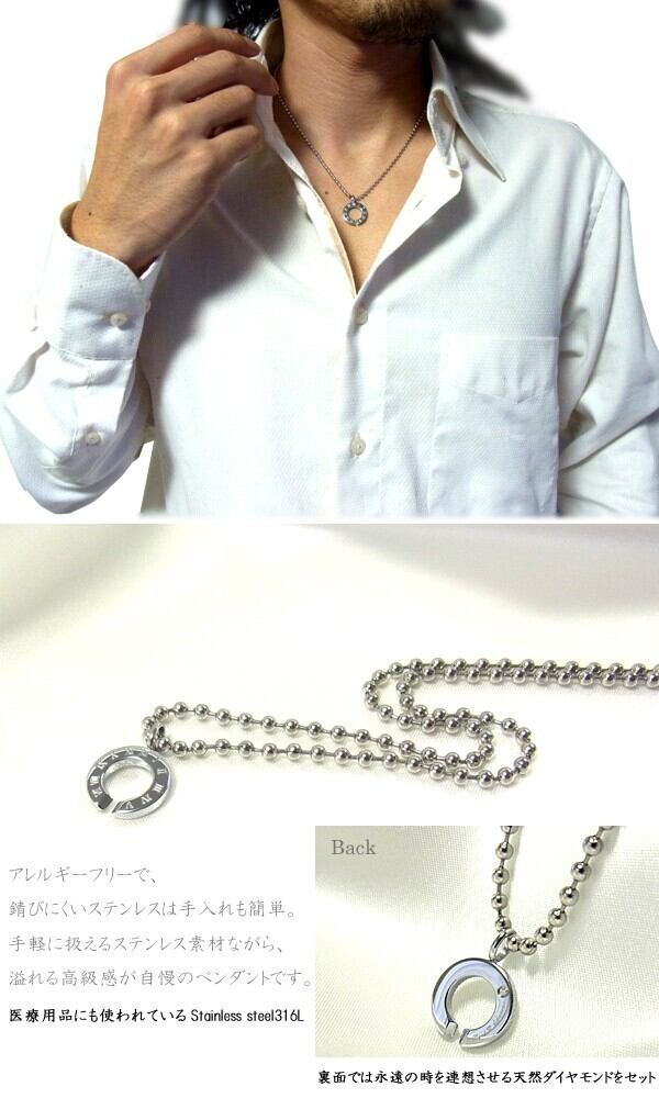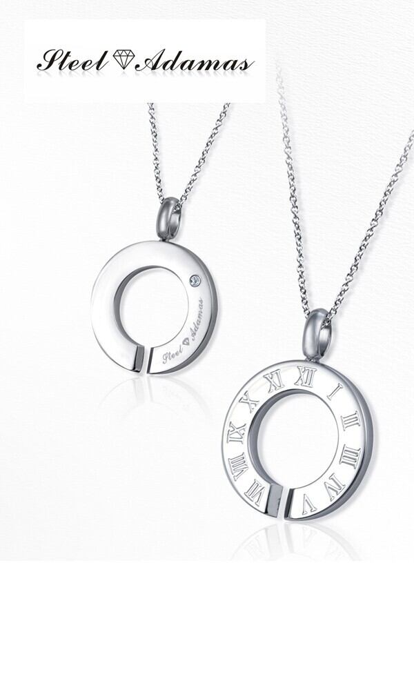 お揃いデザインで一回り大きいサイズあります。綺麗に磨き上げられたサークルには時計のようにローマ数字が並びます。美しくならんだ数字の文字盤の裏で格別に輝くダイヤモンドが「永遠」のときを連想させます。アレルギーフリーで、錆びにくいステンレスは手入れも簡単。手軽に扱えるステンレス素材ながら、溢れる高級感が自慢のペンダントです。