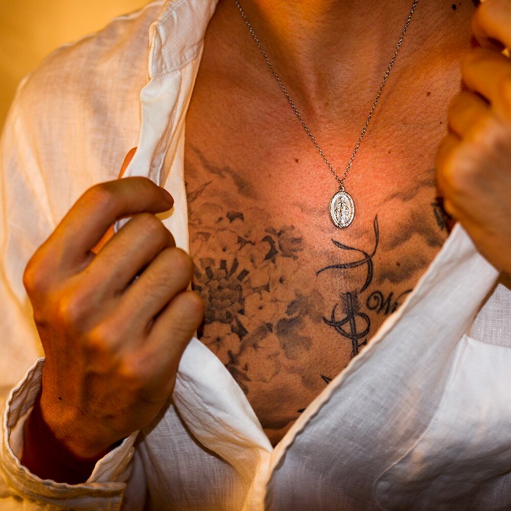 マリアの周りには“O Marie. concue sans peche priez pour nous qui avons recours a vous.(原罪無くして宿り給いし聖マリア、御身に寄り頼み奉るわれらにのために祈り給え)が刻まれており、裏面には、12の星の輪と十字架の上に乗る大きなMの文字、茨に囲まれた王冠を冠したイエス・キリストの心臓と王冠を冠し剣の刺さった聖母マリアの心臓が彫り込まれています。