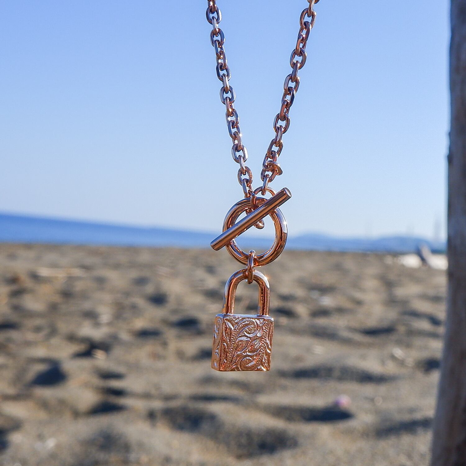 太すぎず使いやすい細さのチェーンに、パドロック(南京錠)チャームをつけて、